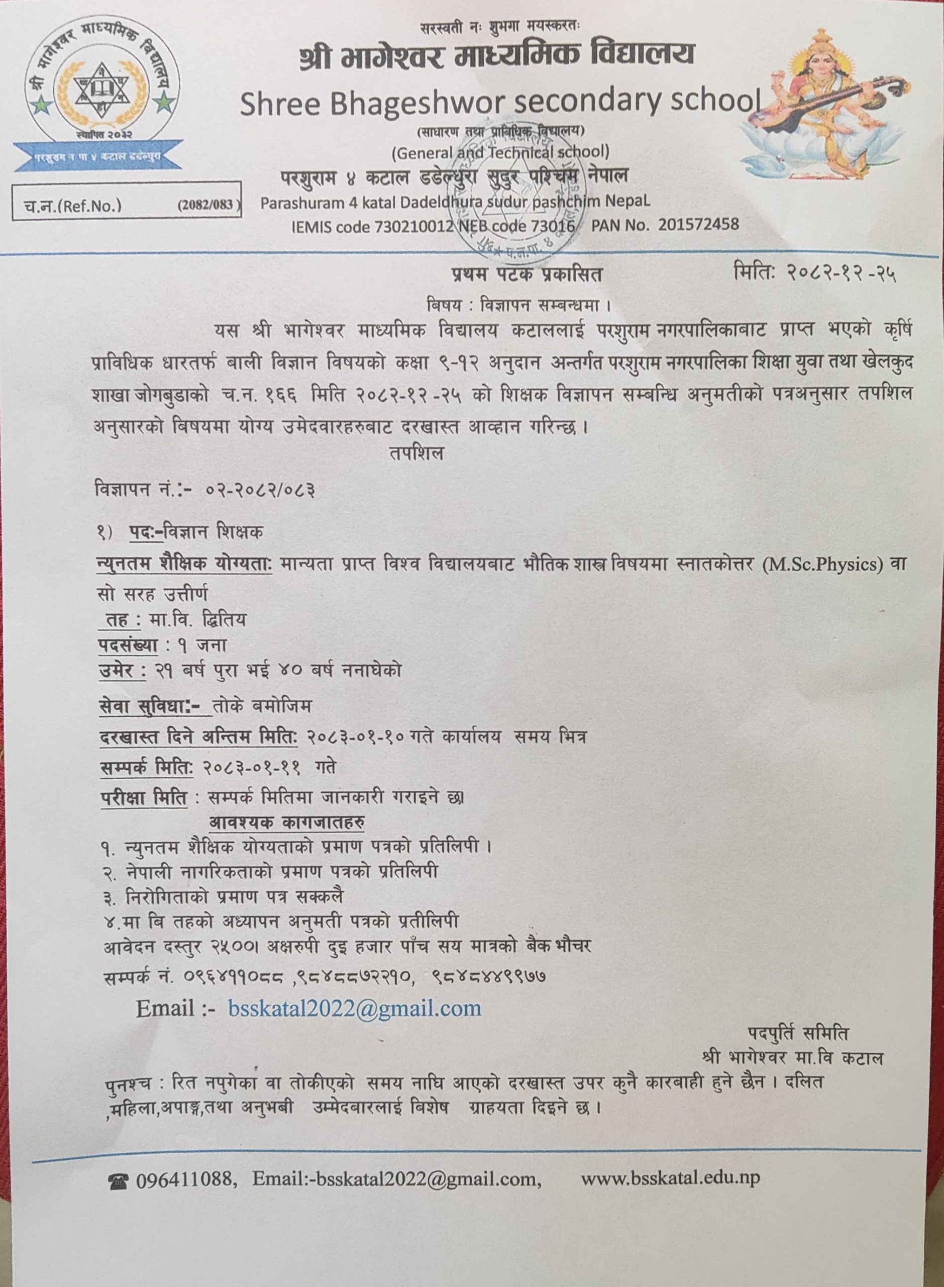 श्री भागेस्वर मा बि कटालमा भौतिकशास्त्र बिज्ञान को शिक्षक आवश्यकता